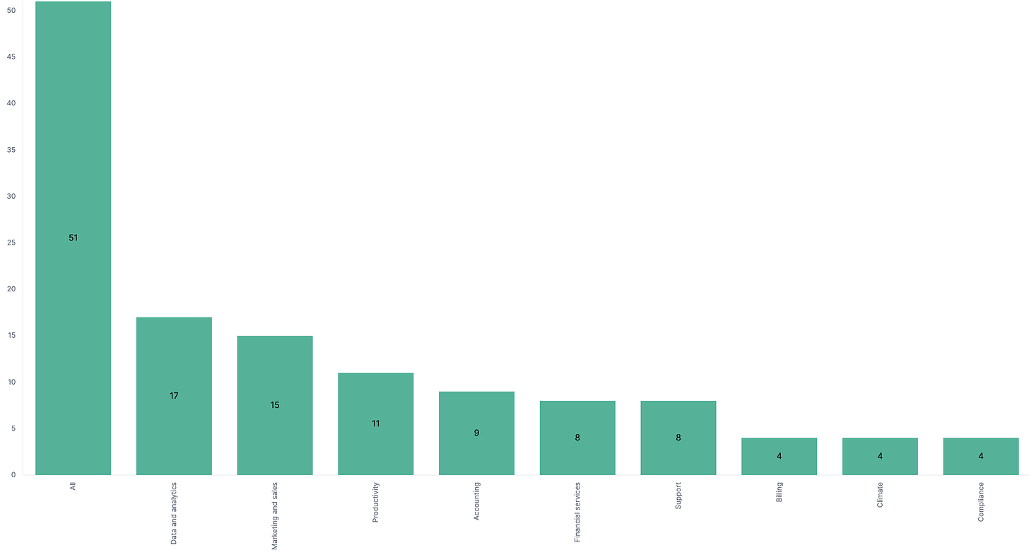 The 3 top categories are ‘Data and Analytics’, ‘Marketing and Sales‘ and ‘Productivity‘. These names suggest that Stripe is focusing on improving decision-making and growth for its clients. Everything that draws sales and reduces costs are in high demand by most businesses.